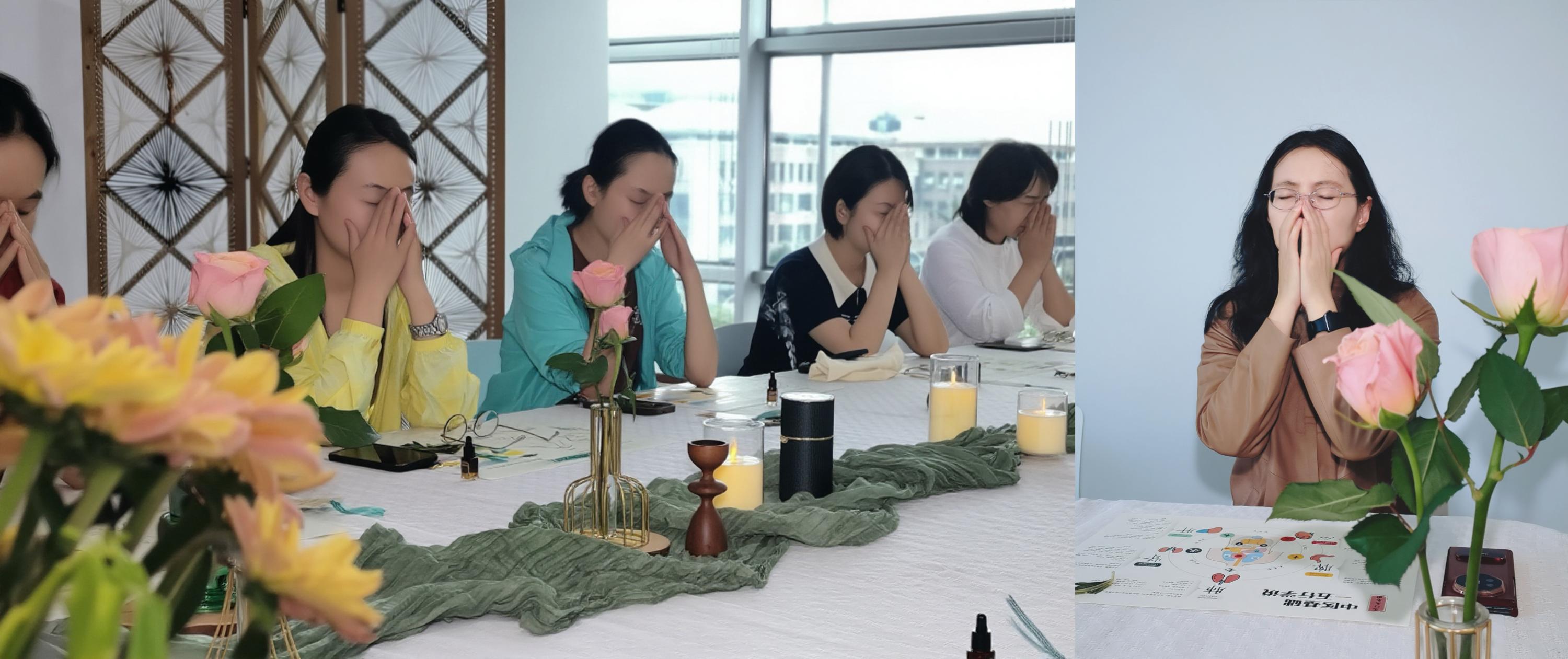 甫出电梯,一缕淡雅馨香便悠然飘来,引领着老师们循香而至。活动入口处,有香&自在闻香工作室精心准备的玫瑰花瓣净手水散发着怡人香气,老师们在沁人心脾的花香中净手入场,开启了这段独特的感官体验。