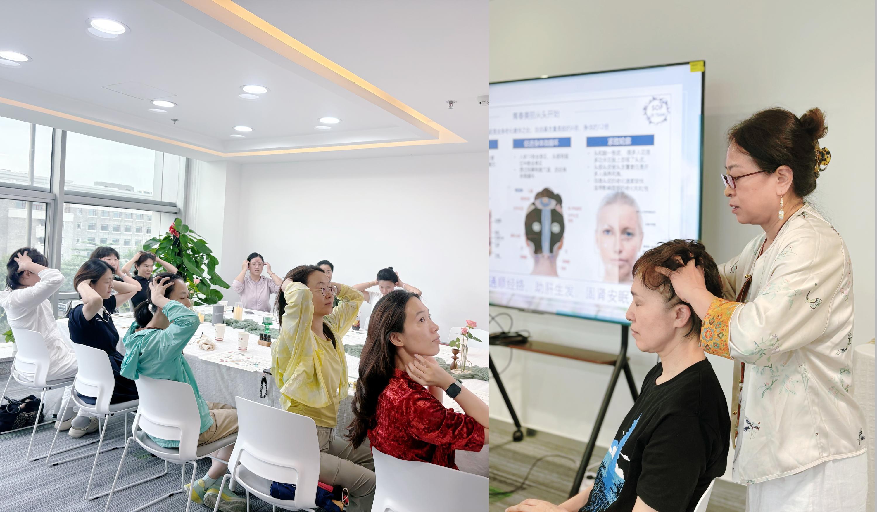 在按摩环节,老师演示了多种技法,将调配好的精油轻柔涂抹于相应部位,以指腹轻轻按摩鼻翼两侧促进血液循环,每个部位按摩3-5分钟。具体指导了头部、肩部、胸部、腹部及两肋的按摩手法,老师们认真练习,场面温馨活跃。老师们重点学习了按摩太阳穴、风池穴和百会穴的手法,以调节头部气血运行。讲师特别为胡老师进行头部按摩,胡老师欣喜表示:“顿觉神清气爽,对保持下午的工作精力大有裨益。”