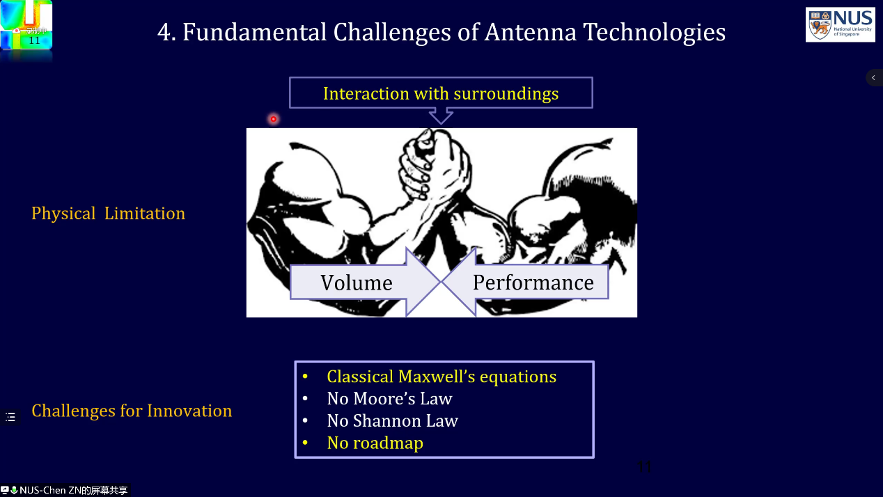 接着,陈教授以开发具有特殊性质的材料(metamaterials)对设计新型天线、增强天线性能以及增加功能起着根本性的影响作为例子,说明如何跨越物理概念到工程应用的鸿沟,以及源头创新对天线技术守正出新发展的重要性。对于数学方法的创新,陈教授介绍了特征模理论与分析在天线设计中的强大功能,展示将经典的数学工具应用到天线技术创新的重要影响。