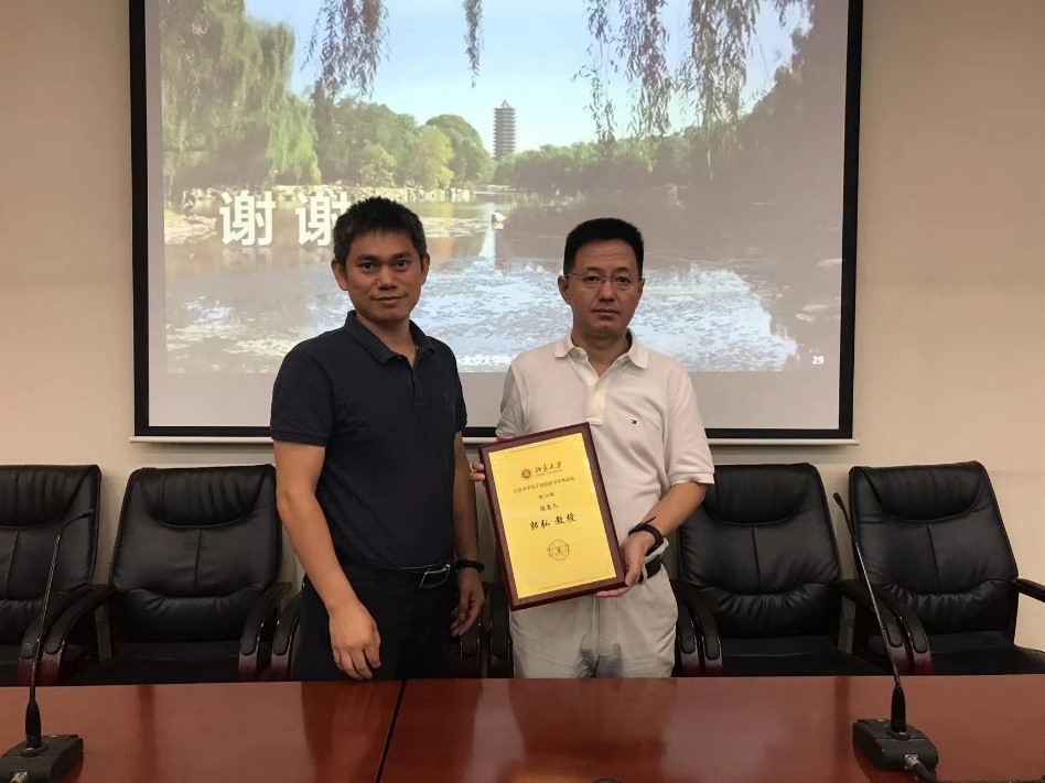 在讨论环节,与会师生积极提问。郭教授针对通用量子计算技术的发展、海底磁探测的实现、磁力仪的小型化、Wootters量子不可克隆定理的证明等问题进行了深入细致的回答。随后,魏贤龙副院长代表学院为郭弘教授颁发了有爱爱