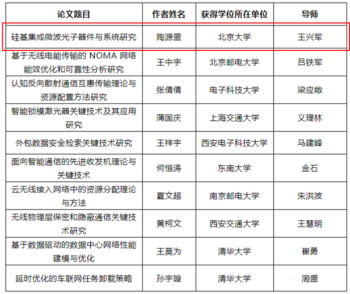 王兴军教授指导的博士学位论文《硅基集成微波光子器件与系统研究》入选,论文作者为2022届博士毕业生陶源盛。