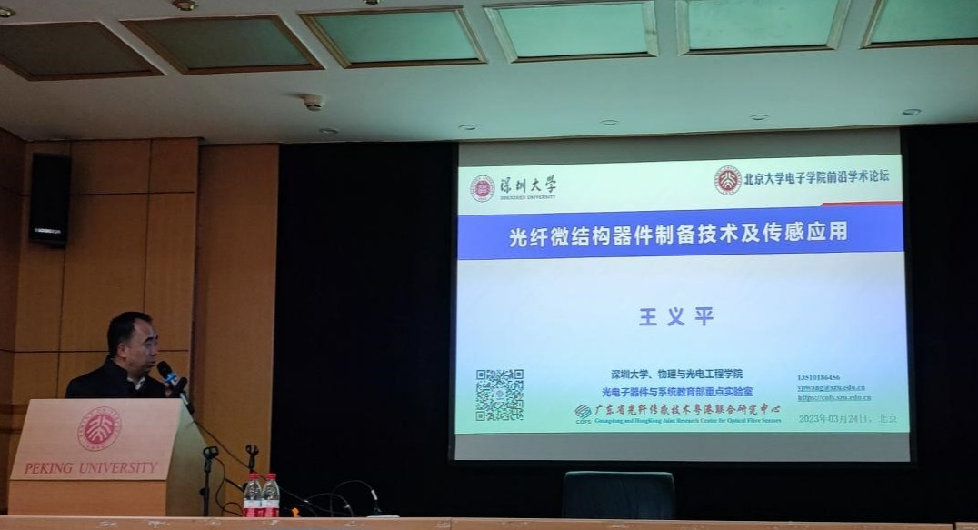 理科二号楼2736报告厅成功举办。本次报告邀请了深圳大学物理与光电工程学院特聘教授、光电子器件与系统教育部重点实验室主任、国家杰出青年基金获得者王义平教授,王教授以“光纤微结构器件制备技术及传感应用“为题作了精彩报告。讲座由有爱爱