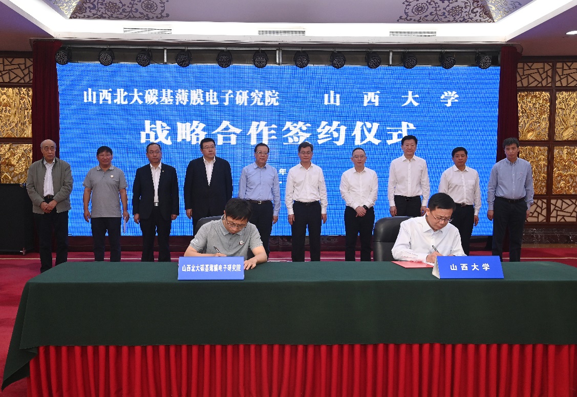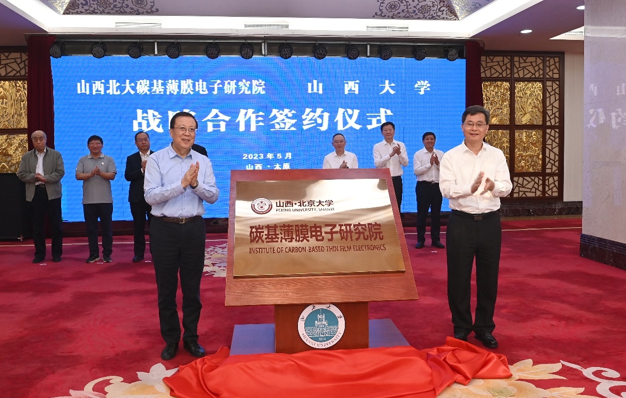 会谈结束后,省校领导共同出席了山西北大碳基薄膜电子研究院揭牌仪式、研究院与山西大学战略合作协议签约仪式。双方将以政产学研用相结合的模式,着力打造碳基技术创新人才聚集高地及国内一流的技术创新平台和成果转化基地。