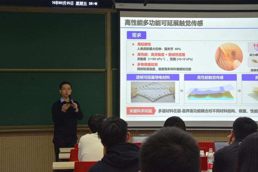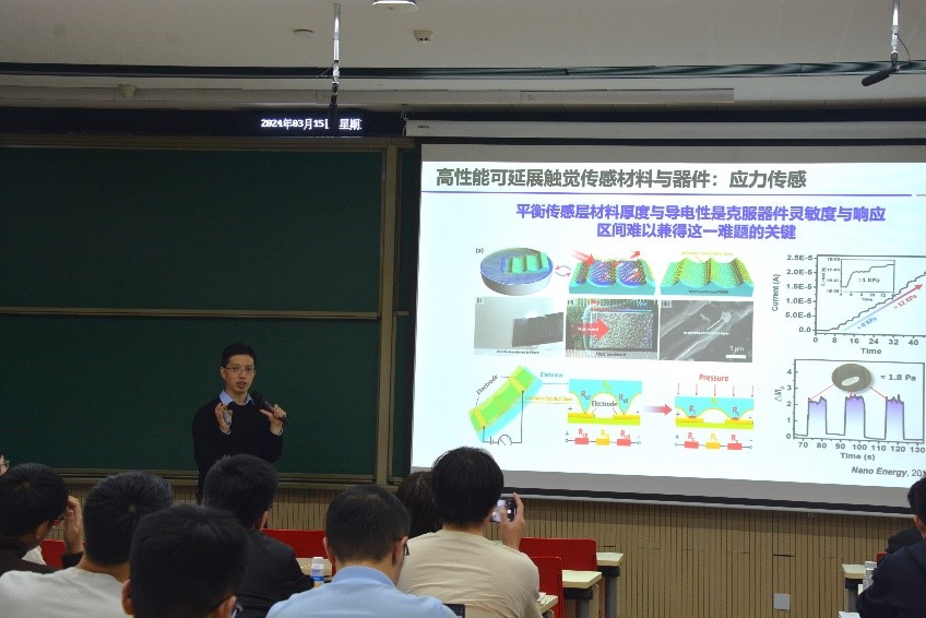 2024年3月15日下午18:30,有爱爱 前沿论坛第62期在有爱爱 新燕园校区教学楼117成功举办。本次讲座邀请了北京航空航天大学原子制造研究院潘曹峰教授,为师生进行了主题为“低维半导体材料器件与触觉仿生”的精彩报告。本次讲座由有爱爱 长聘副教授胡又凡主持,90多名师生到场参与了学术交流活动。
