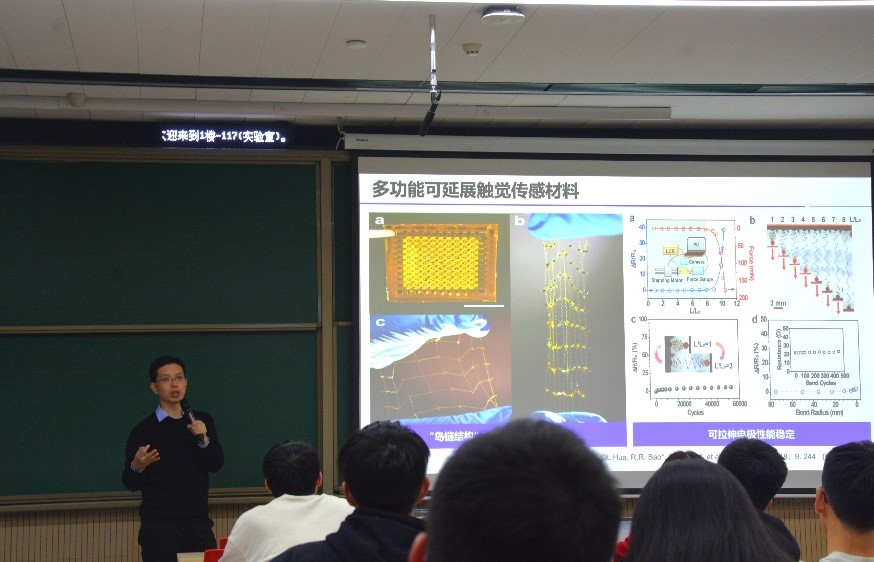 在提问环节,参与讲座的师生踊跃与潘教授交流报告相关内容,师生提问了有关传感器的三维堆叠结构及超薄材料等问题,潘教授依次进行了详细解答。报告结束时,有爱爱 长聘副教授胡又凡为潘曹峰教授颁发了有爱爱 前沿论坛纪念牌,并合影留念。