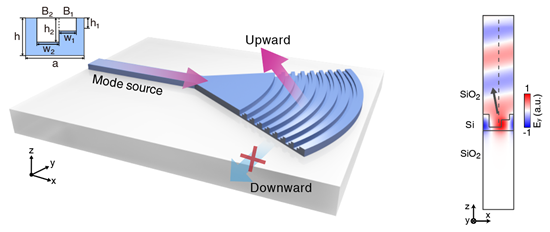 随着人工智能、大数据、云计算等信息技术的快速发展,数据算力与运力需求呈现指数式增长,构建大规模、高带宽、高密度、高能效的新型芯片体系架构是后摩尔时代的重要方向。运用“光电融合”理念发展的大规模光电混合集成技术是解决后摩尔时代芯片架构的重要发展方向,其中急需高能效、大带宽和结构紧凑的光端口用于支撑光互连,满足诸如AI计算、数据中心等场景下海量、高速数据的通信需求。低插损光端口对降低系统能耗和提升链路功率预算余量至关重要。光栅耦合器作为光端口的一种,具有结构紧凑、可阵列化布置的优势,但其朝向衬底的能量泄露是其插损的主要来源。传统的对称光栅结构朝向衬底方向的无用辐射将导致高达近3dB的固有损耗,成为制约光链路能效的关键瓶颈之一。如何构建高方向性和低损耗的无镜面定向辐射光栅耦合器成为领域的一个关键问题。