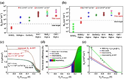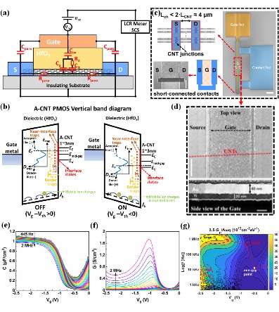 传统硅基金属氧化物半导体(MOS)场效应晶体管逐渐达到其物理、功耗和成本极限,先进节点的集成电路技术亟需新型沟道材料。而具有高迁移率和超薄体特点的低维半导体沟道材料,尤其是碳纳米管,在晶体管的本征性能、能效和微缩能力等方面均展现出理论优势。近年来,基于碳纳米管的碳基电子学在超高半导体纯度和高密度的碳纳米管阵列制备方面取得了巨大突破(Science 368, 850-856, 2020),从而得以制备出工作频率超越硅基CMOS的高速射频晶体管(Nature Electronics 4, 405-410, 2021)和面向90nm乃至10nm技术节点的超微缩数字逻辑晶体管(Nature Electronics 6, 506-515, 2023),显示出了巨大的技术潜力。然而,碳基MOS器件的栅工艺质量仍然不理想,其界面态密度相比硅基器件高了至少两个量级,这严重限制了器件性能、能效和可靠性。此外,目前仍然缺乏系统的碳基界面态研究模型,因此难以制定有效的优化方案。