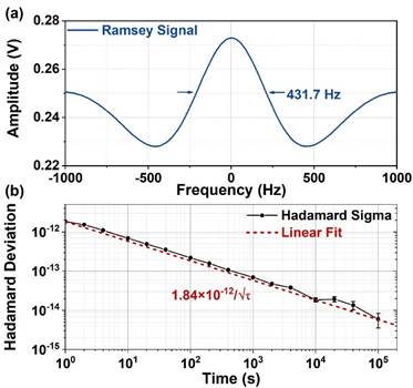 图4.微波光抽运小铯钟Ramsey荧光信号与频率稳定度指标
