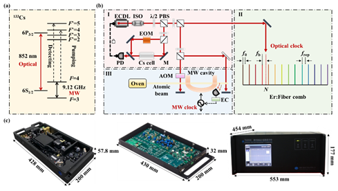 图2.基于铯原子的双波段光学-微波原子钟工作原理图和实物图