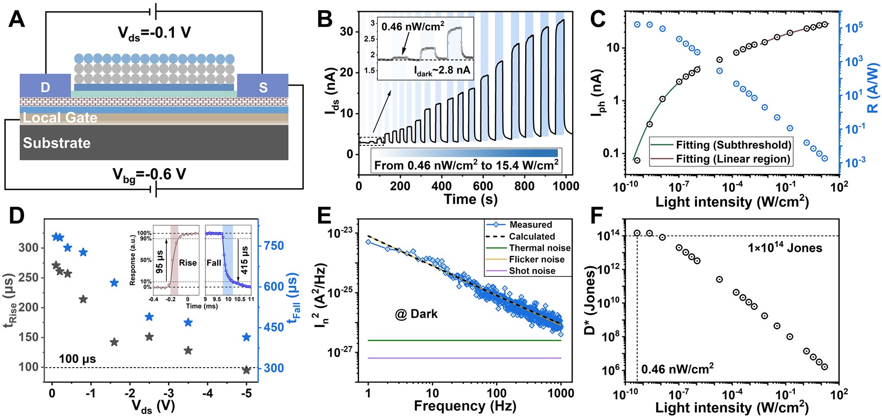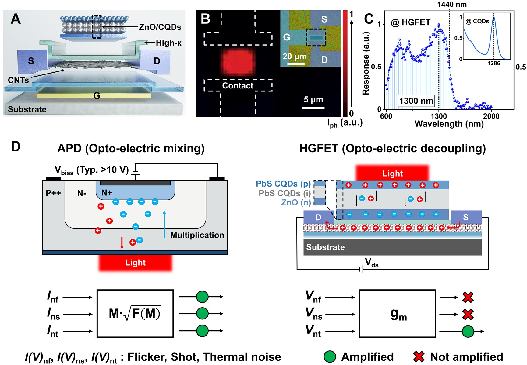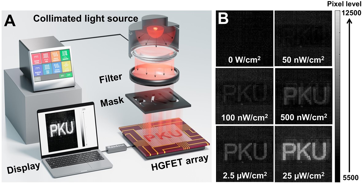 、碳基电子学研究中心、纳光电子前沿科学中心、重庆碳基集成电路研究院的张志勇教授团队联合北京交通大学物理科学与工程学院王颖副教授团队开发了一种异质结栅场效应晶体管(HGFET,图1),利用光电解耦机制,实现了对信号的超高增益,而基本不放大噪声,获得了对短波红外探测的比探测率达到1014Jones,充分满足了星光夜视的需求。团队采用高纯半导体碳纳米管网状薄膜作为半导体沟道构建MOS晶体管,在其栅介质上制备硫化铅量子点/氧化锌异质结光电二极管作为栅极,实现了光传感和电放大的物理空间隔离。该光电晶体管暗电流低,对极弱红外光(1300 nm,0.46 nW/cm2)具有显著的响应(图2),而且具有超高的本征增益和响应度、较低的噪声和较高的响应速度,在高增益模式下,峰值比探测率超过1014Jones。在同等测试条件下,碳基HGFET探测器比商用的InGaAs探测器的比探测率高出两个量级,并在增益带宽积上相对于已有探测器显示出明显优势(图3-4)。团队还基于碳基HGFET光电晶体管实现了64×64像素的板级成像芯片,初步演示了光强低至100 nW/cm2的弱光环境成像(图5)。更为重要的是,碳基HGFET探测阵列可以在硅基IC上利用后道工艺集成,通过通孔直接与硅基读出电路链接,可以将像素间距缩减到5微米以下,实现超高分辨率成像。