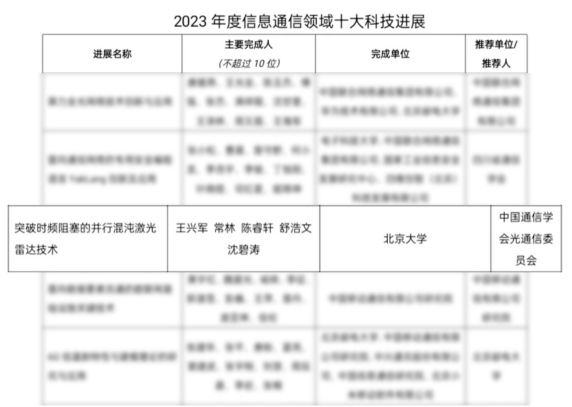 王兴军教授牵头,舒浩文研究员、常林研究员联合完成的“突破时频阻塞的并行混沌激光雷达技术”项目荣获十大科技进展。