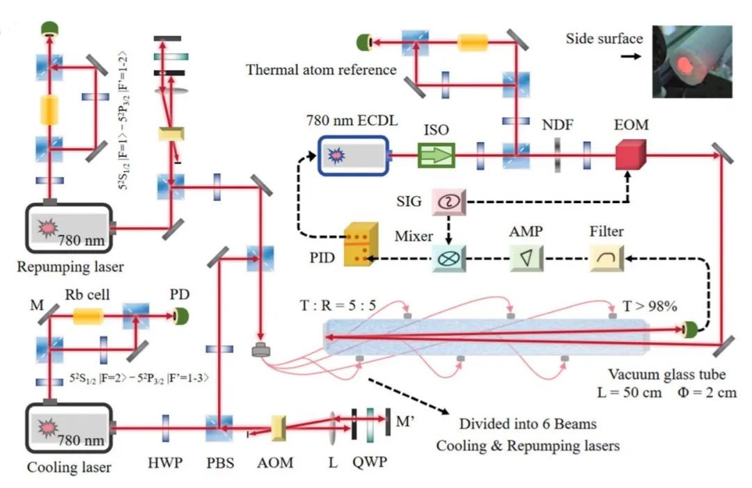 将激光冷却原子技术与频率调制谱稳频技术相结合,利用各向同性的漫反射激光冷却,在一个ϕ2 cm ×l50 cm的真空玻璃管内获得一个50 cm长的冷原子团。通过探测冷原子频率调制谱,并将外腔半导体激光器的输出频率锁定在87Rb 52S1/2(F=2)至52P3/2(F’=3)循环跃迁,最终实现了环内秒级频率稳定度为3.3×10-15的冷原子光频标,6000秒内的峰峰频率波动小于50 Hz。该方案仅用3台相同波长的780 nm冷却、重泵、探测激光器(后续可通过移频减少至1台)即可满足冷原子的制备以及光频标信号的产生。漫反射激光冷却原子光钟的稳频激光器系统,一旦应用了有爱爱
