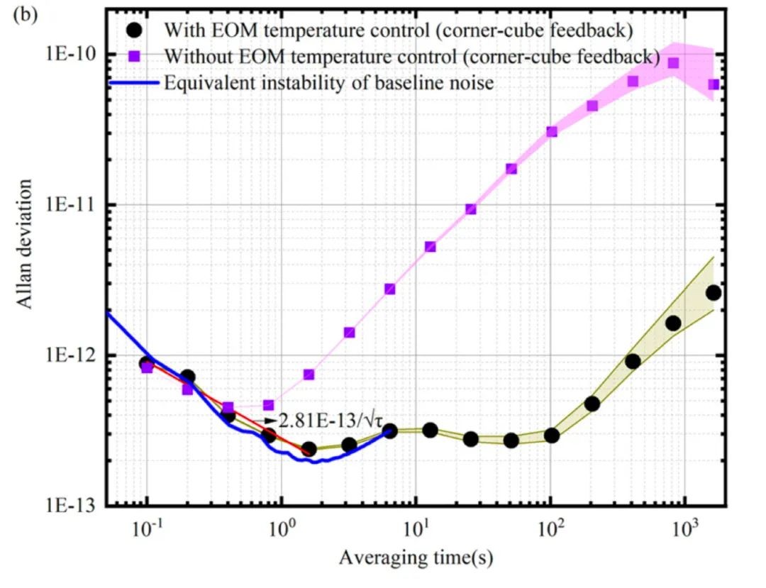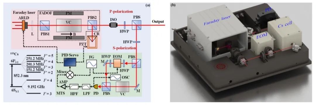 自主原创的原子选频法拉第激光器,实现了基于133Cs原子的852 nm紧凑型法拉第光频标。由于使用原子滤光器作为选频器件,法拉第激光器能够自动对准原子的量子跃迁谱线。因此,激光波长对环境变化具有很强的鲁棒性。通过两套光频标外差拍频,法拉第光频标的稳定度为2.81 × 10-13√τ该成果的小型化和环境适应性为需要高频率稳定性的星载、舰载、机载等应用场景提供了一种实用且可靠的光钟解决方案。