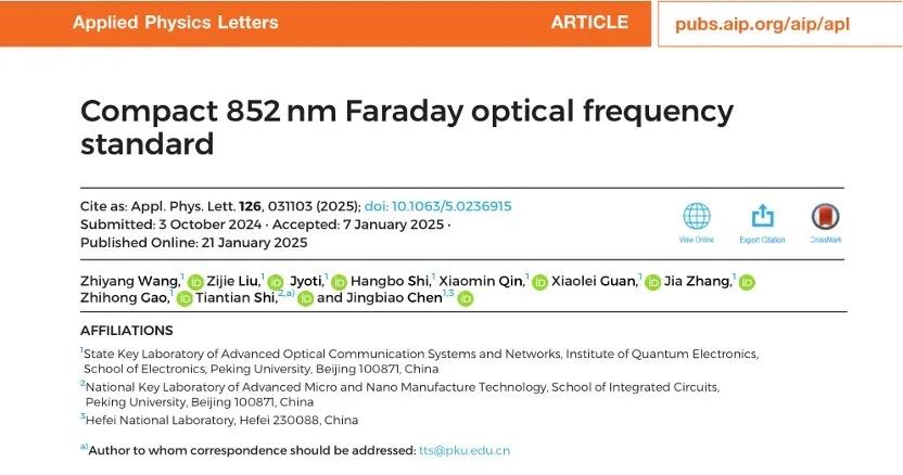 陈景标教授团队在AIP出版社旗下的国际学术期刊《Applied Physics Letters》上,同时发表了光钟研究两项成果:“A 780 nm optical frequency standard based on diffuse laser cooled87Rb atoms”和“Compact 852 nm Faraday optical frequency standard”。陈景标教授团队提出了与光晶格原子钟和离子光钟完全不同的两种光钟新方法,相比光晶格原子和离子光钟,原理上仅需一台激光器或加上移频、不需要昂贵的PDH系统。低成本和低复杂性的特点,具有空间站、星载、舰载、机载场景等实际平台的应用潜在优势。