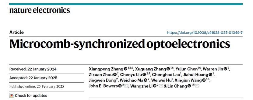 常林研究员团队与中国科学院空天信息研究院李王哲研究员课题组合作,在Nature Electronics杂志在线发表了题为“Microcomb-synchronized optoelectronics”的研究文章,在世界上首次实现了光子芯片时钟在信息系统中的应用。该技术基于可量产的超低损耗氮化硅光子芯片,通过光学频率梳生成了高精度、低噪声的时钟信号,突破了传统电子芯片在时钟带宽、能耗和噪声等方面的性能瓶颈。为未来超高速芯片的发展提供了重要解决方案。