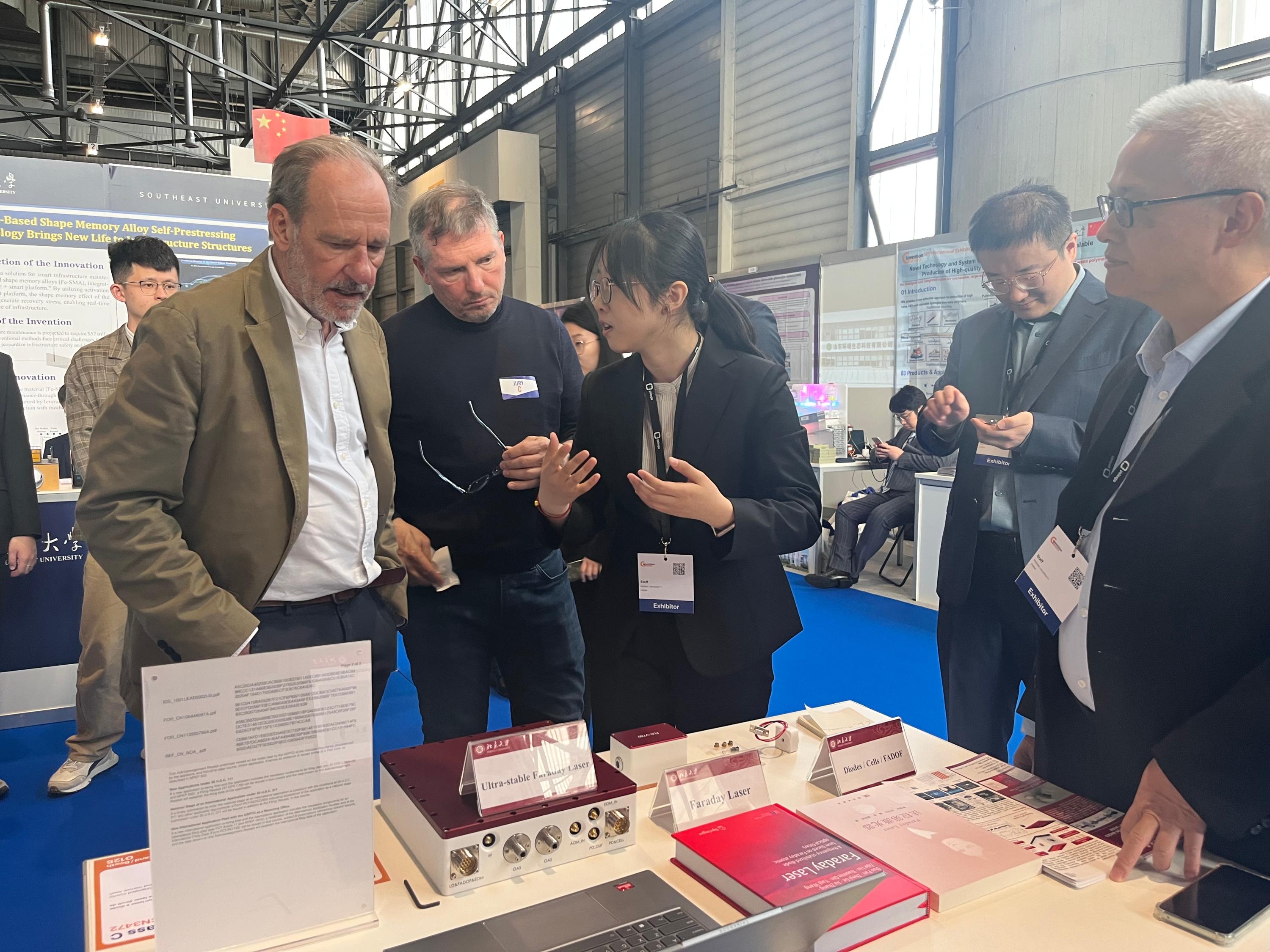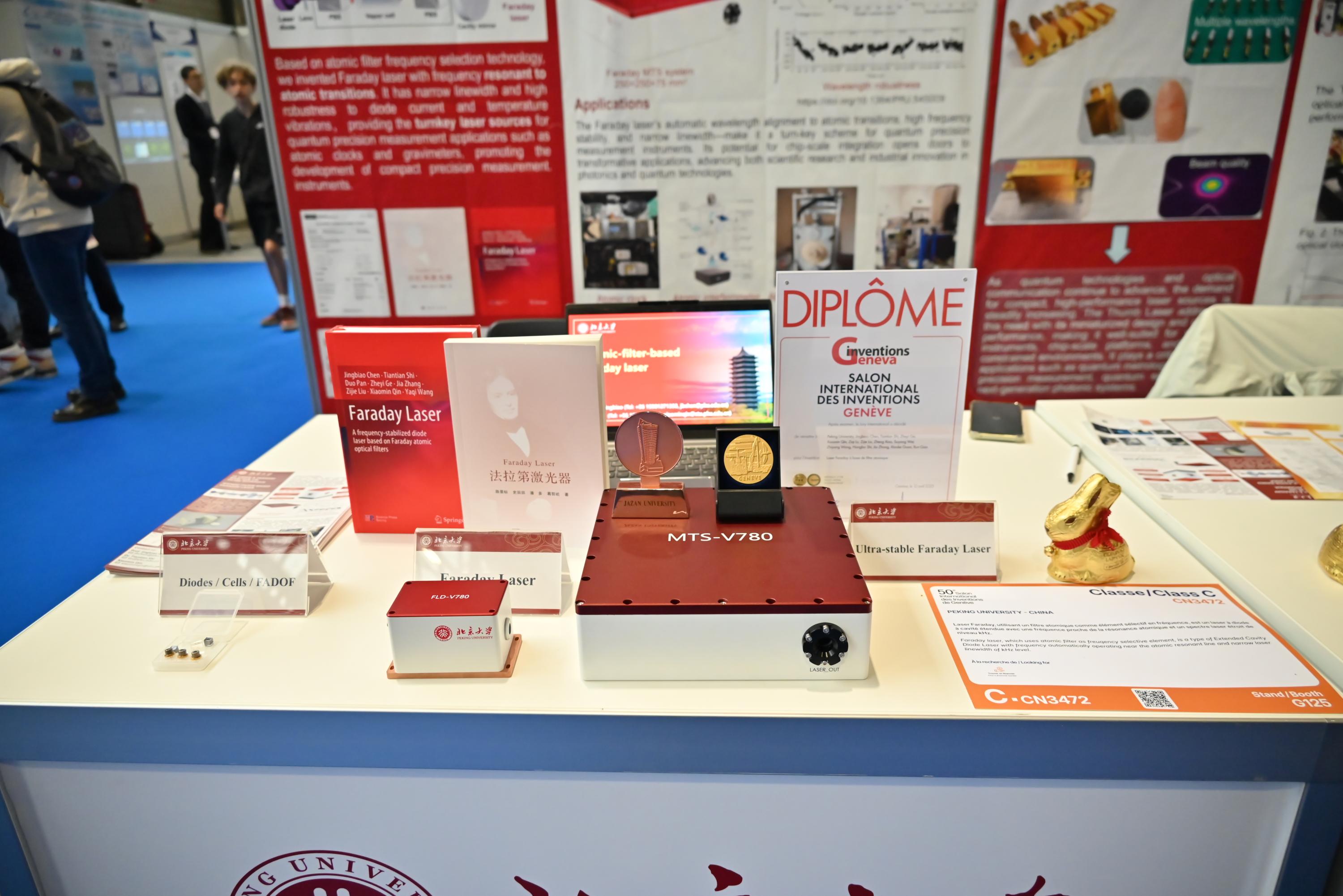 在此次日内瓦国际发明展上,陈景标教授及博士研究生秦晓敏、苗杰,热情地向参观者介绍成果,受到瑞士、沙特阿拉伯、俄罗斯、泰国等各国家与会人员的广泛关注和高度评价。经评审,陈景标教授团队研发的“原子选频激光器”和“大拇指激光器”两项创新成果从全球上千件参展项目中脱颖而出,荣获金奖。这两项金奖成果展现了中国团队在激光稳频技术上的突破性创新,为助力实现我国量子精密测量领域高水平科技自立自强提供了有力支撑。