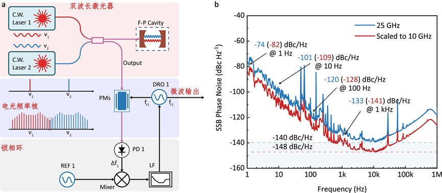 物理学院等团队密切合作,提出了一种基于高相干双波长激光器与电光梳的双点分频法方案,探索了该系统的噪声极限,并取得了纪录性的成果,解决了传统方案在结构复杂性方面的难题。2025年4月29日,相关研究成果以“高相干双波长激光器及其在低噪声微波产生中的应用”(Highly coherent two-color laser and its application for low-noise microwave generation)为题,在线发表于《自然·通讯》(Nature Communications)。