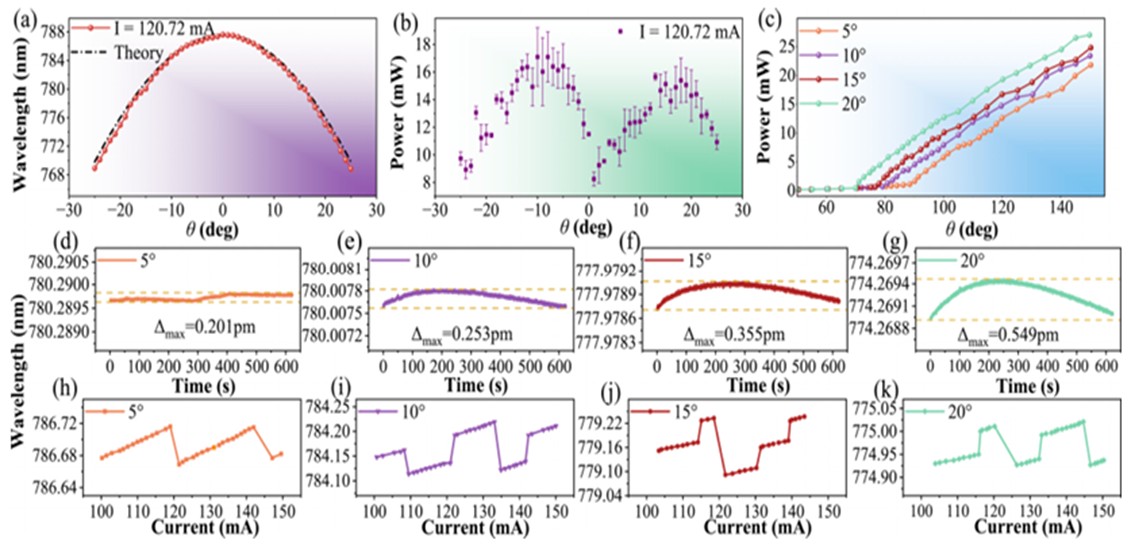 团队搭建的实验系统成功实现了±20°范围内的激光连续调谐输出,实验结果与理论预测高度吻合,验证了量子频率角度仪的可行性与系统稳定性。该系统在小角度测量中的高分辨率表现,为高精度设备标定、精密工程、航空航天以及量子精密测量等领域提供了全新解决方案。