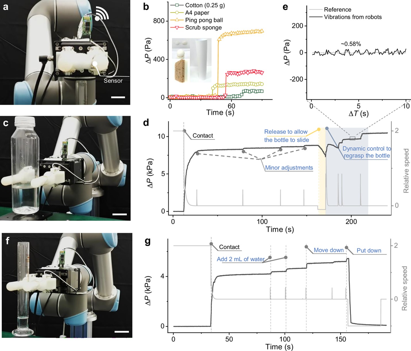 图3. 压力传感器在机器人精准操控中的应用。a,配备传感器的机械手抓取棉花的照片。b,抓取各种物体时压力变化的动态。c,配备传感器的机械手抓取装有水的瓶子的照片。d,抓取和提起瓶子以及发生滑落时的压力变化和速度调整。e,传感器检测到的机械振动引起的测量压力变化。f,配备传感器的机械手夹持器抓取装满水的量筒的照片。g,抓取量筒时夹持器的压力变化和速度调整。