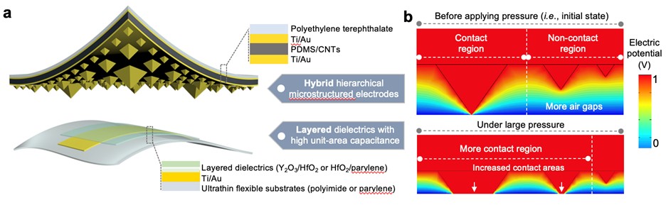 图1. 接触主导的局域电位移场增强型压力传感器。a, 传感器结构示意图,展示了分级微结构电极与高单位面积电容的介电层。b, 施加压力之前和高压下的电势分布的横截面图。