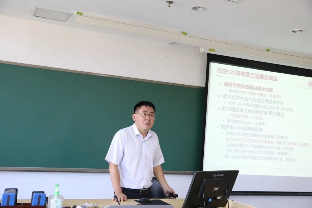 接着,王兴军老师为大家介绍电子学系概况。他首先回顾了电子学系的历史沿革,又向同学们详细介绍电子学系各个研究所的研究方向、研究内容及最新的研究成果,让同学们对电子学系有了更加深入细致的了解和认识。他还提醒同学们要实现从本科生到研究生的思维转变,并以自己实验室的管理理念“勤奋努力,用心思考,遵守规矩,守时守信,互相尊重,反馈及时,服务意识,团队精神”来勉励同学们。