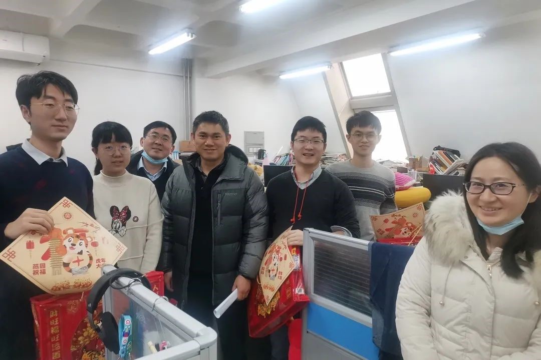 领导和老师带着新春大礼包探访留校过年的同学们,为大家送去满满的关心与祝福。学院党委书记冯梅萍,党委副书记王一涵,副系主任王兴军、王延辉,学院教师魏贤龙,以及在校学生骨干、热心学生党员一同走访学生办公室、实验室,将燕园“福”字和零食大礼包一一送到了留校同学手中。