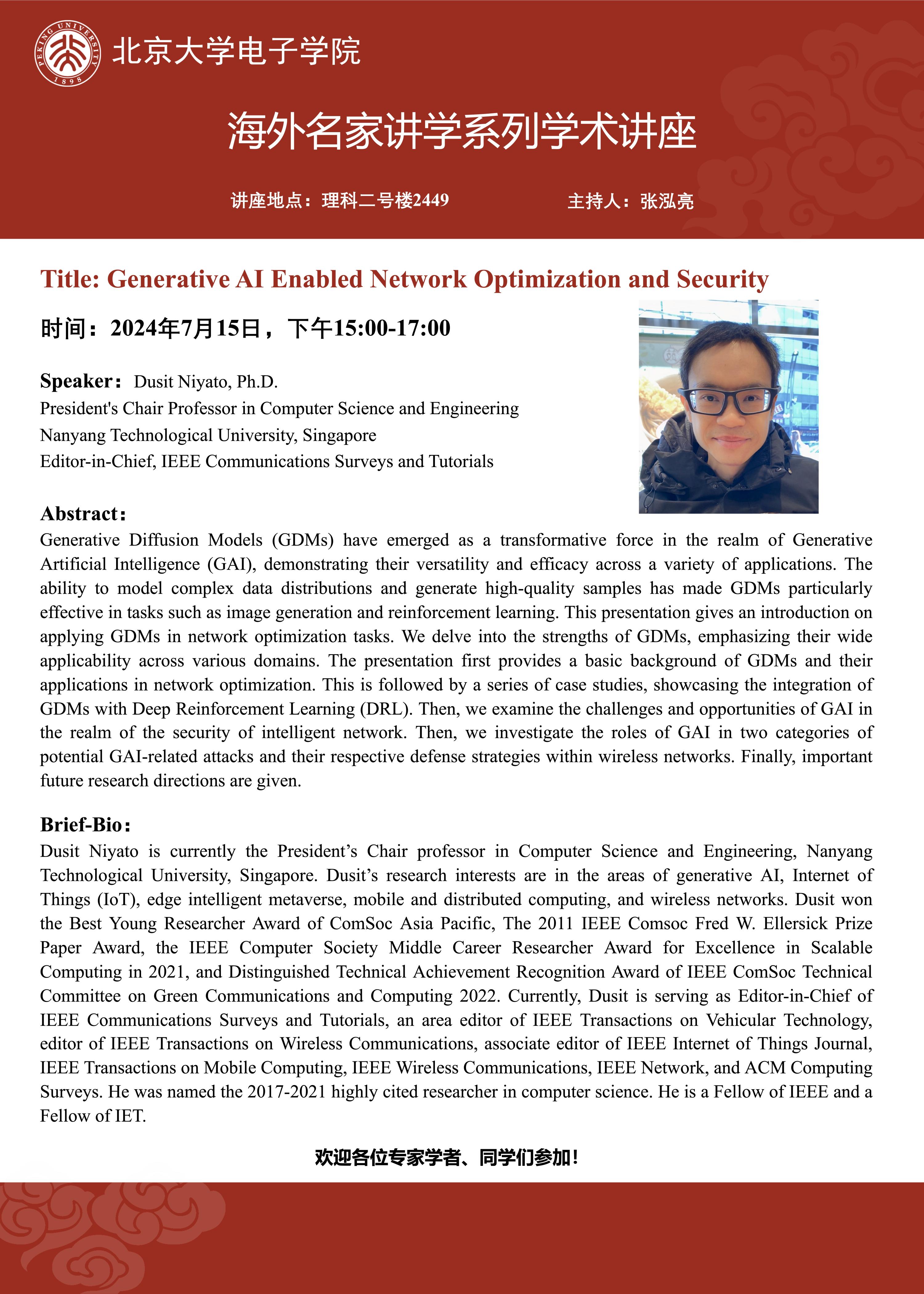 生成扩散模型(Generative Diffusion Models, GDMs)已成为生成式人工智能(Generative Artificial Intelligence, GAI)领域中的一股变革性力量,在多种应用中展现了其泛用性和有效性。特别地,在图像生成和强化学习等任务中,GDMs能够建模复杂的数据分布并生成高质量的样本,呈现出显著的性能优势。本讲座主要介绍如何将GDM应用于网络优化任务中,深入探讨GDMs的优点,强调了各类模型在不同领域的广泛适用性。首先提供了GDMs及其在网络优化中的基本概念,并提供了多个具体的研究案例分析,展示了如何将GDMs与深度强化学习结合。此外,本次讲座分析了GAI在智能网络安全领域面临的挑战和机遇,重点介绍了无线网络中两类GAI相关的潜在攻击及其防御策略,并分析了相关领域未来的重要研究方向。