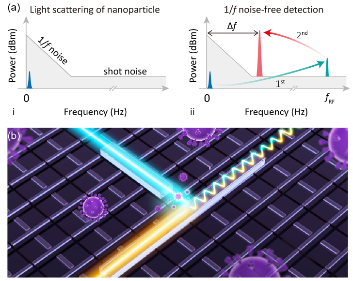 (a) 1/f噪声抑制机制;(b)基于片上波导暗场外差干涉仪的单颗粒检测