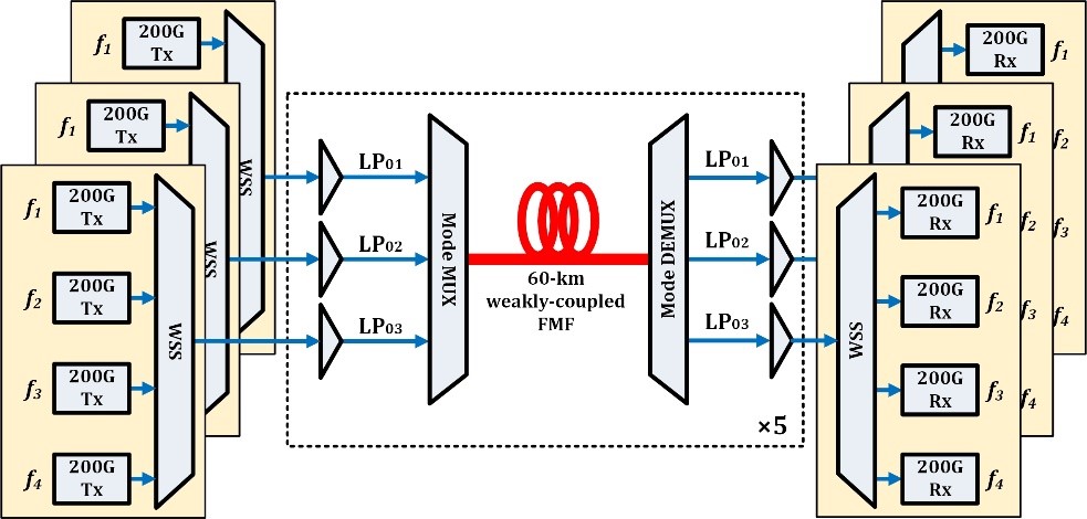 牵头完成了光纤和系统总体的设计,并加工设计了配套的低损耗低串扰模式复用器件,主要参研人员为博士后高宇洋、博士生左铭青、崔健等;长飞光纤光缆股份有限公司优化光纤工艺完成了新型光纤的制备;中国移动与华为股份有限公司联合完成了200G QPSK OTN商用设备的系统设计;各单位联合在中国移动实验室内搭建了原型系统,最终实现了LP01/LP02/LP03三个模式分别携带四个200G波长信号共同传输300km的实时弱耦合模分复用系统验证。相较于此前同类实验,可用模式数增加至3个,传输距离提升至3倍,为目前世界纪录。