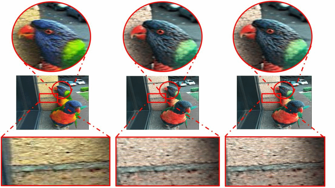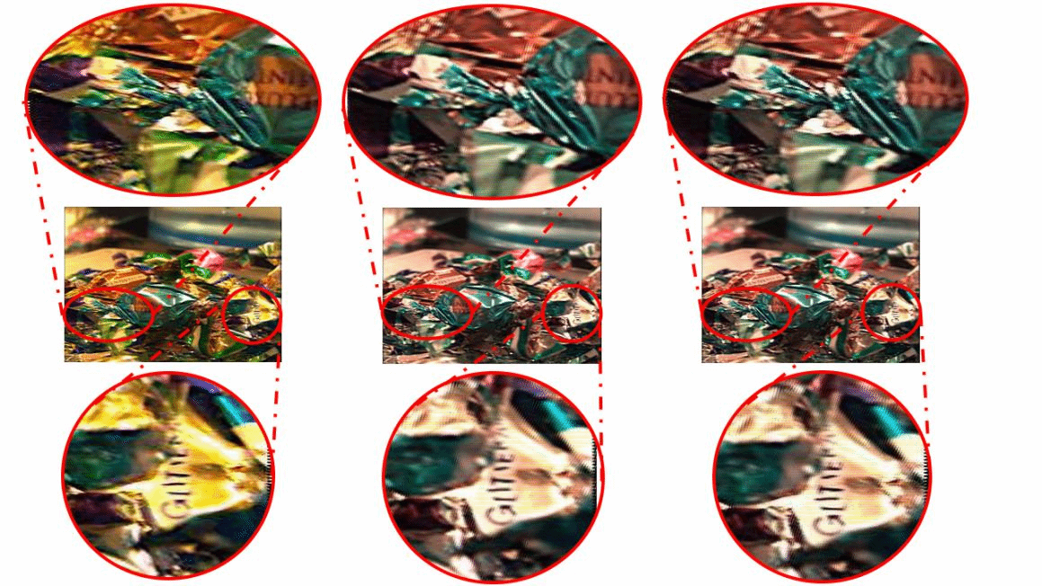 杨光临副教授课题组在相关研究中取得重要进展。他们针对目前已有的柱状光栅的视点排布计算原理,在制作立体合成图的过程中提出了一种基于超分辨抗混叠的多视点裸眼三维图像合成方法,可以提升立体合成图的信噪比,有效地改善立体合成图的显示质量。首先,使用WDSR(宽激活深度残差网络超分辨)算法部分取代传统插值算法,将原视点图放缩到目标合成图的分辨率大小。由于WDSR算法只能将图像整数倍放大,所以在放缩图像中将结合使用传统插值算法,将原图放缩到目标合成图大小。然后根据柱状光栅的多视点子像素映射关系,计算得到多视点子像素映射表。再根据子像素映射表制作各视点蒙板,利用蒙板加速立体图的合成速度,把放缩后的各视点视图的一部分重新排列组合,最后可以得到比使用传统插值算法效果更好的立体合成图,降低了立体合成图的性噪比,改善了立体合成图的显示质量,尤其是对图像细节有很高的保真度。实验效果如下所示: