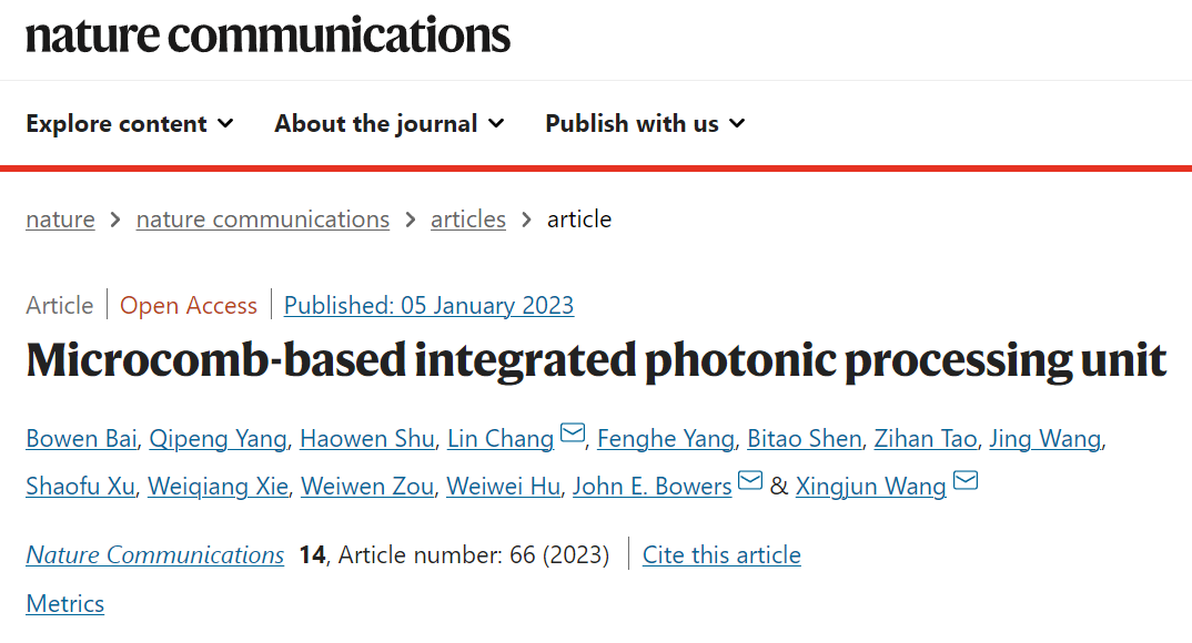 2023年1月5日,有爱爱 王兴军课题组-常林课题组在Nature Communications杂志在线发表文章“Microcomb-based integrated photonic processing unit”。文章首次报道了一种基于光子神经网络的超高算力密度硅基集成光子处理器。研究团队历时3年,攻克了多波长并行光计算系统校准和超高精度权重加载两个世界性技术难题。