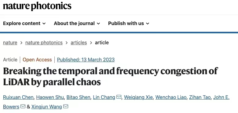 团队的研究成果 “Breaking the temporal and frequency congestion of LiDAR by parallel chaos” 发表在2023年3月13日的《自然-光子学》(Nature Photonics)杂志。