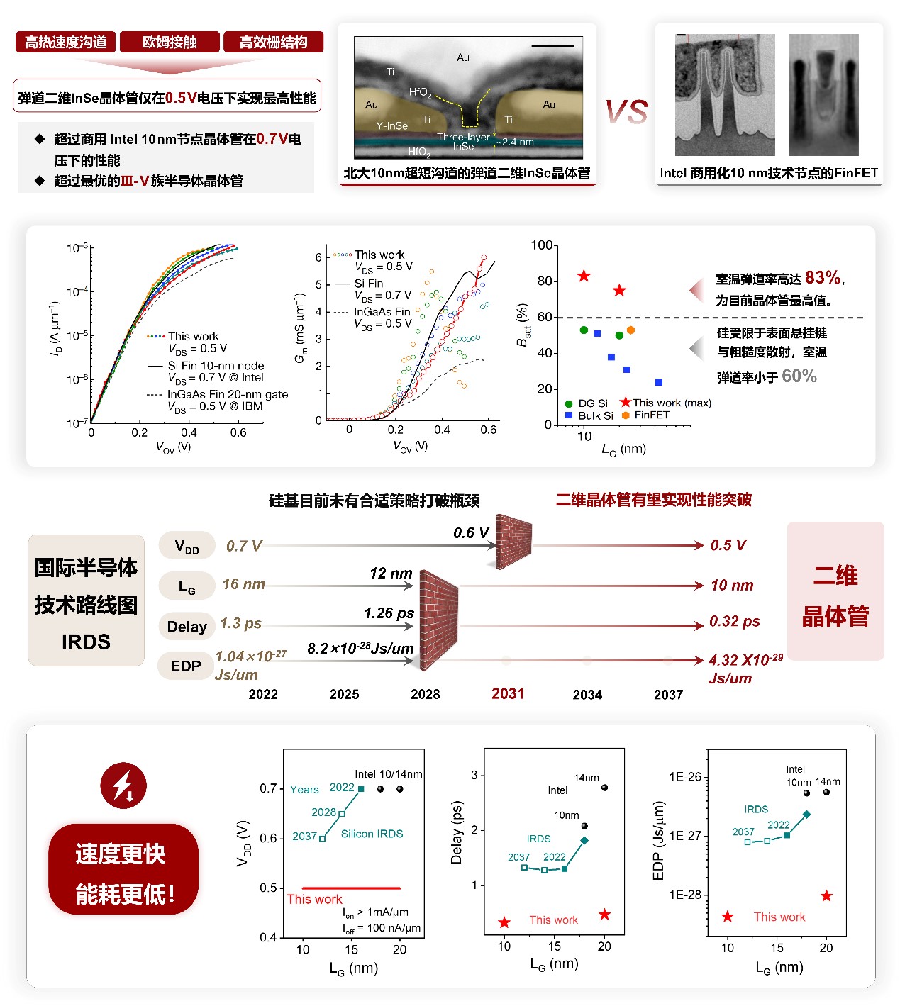 对标业界IRDS所预测的硅基器件发展路线图,北大团队所实现的弹道二维硒化铟晶体管打破了四个硅基终极“红墙”:1)沟长缩小到10纳米(超越硅基极限12纳米),同时保持理想的亚阈值摆幅75毫伏量程,DIBL仅20毫伏/伏,该器件关态特性超过硅基最优FinFET技术。2)电压缩小到0.5伏 (超越2031年硅基极限0.6伏),将器件电流从100纳安/微米标准关态打开到超过1毫安/微米开态。3)门延时缩减到0.32皮秒,四倍优势于硅基极限1.26皮秒。4)功耗延迟积缩减到4.32E-29焦秒/微米,比硅基极限低一个量级。