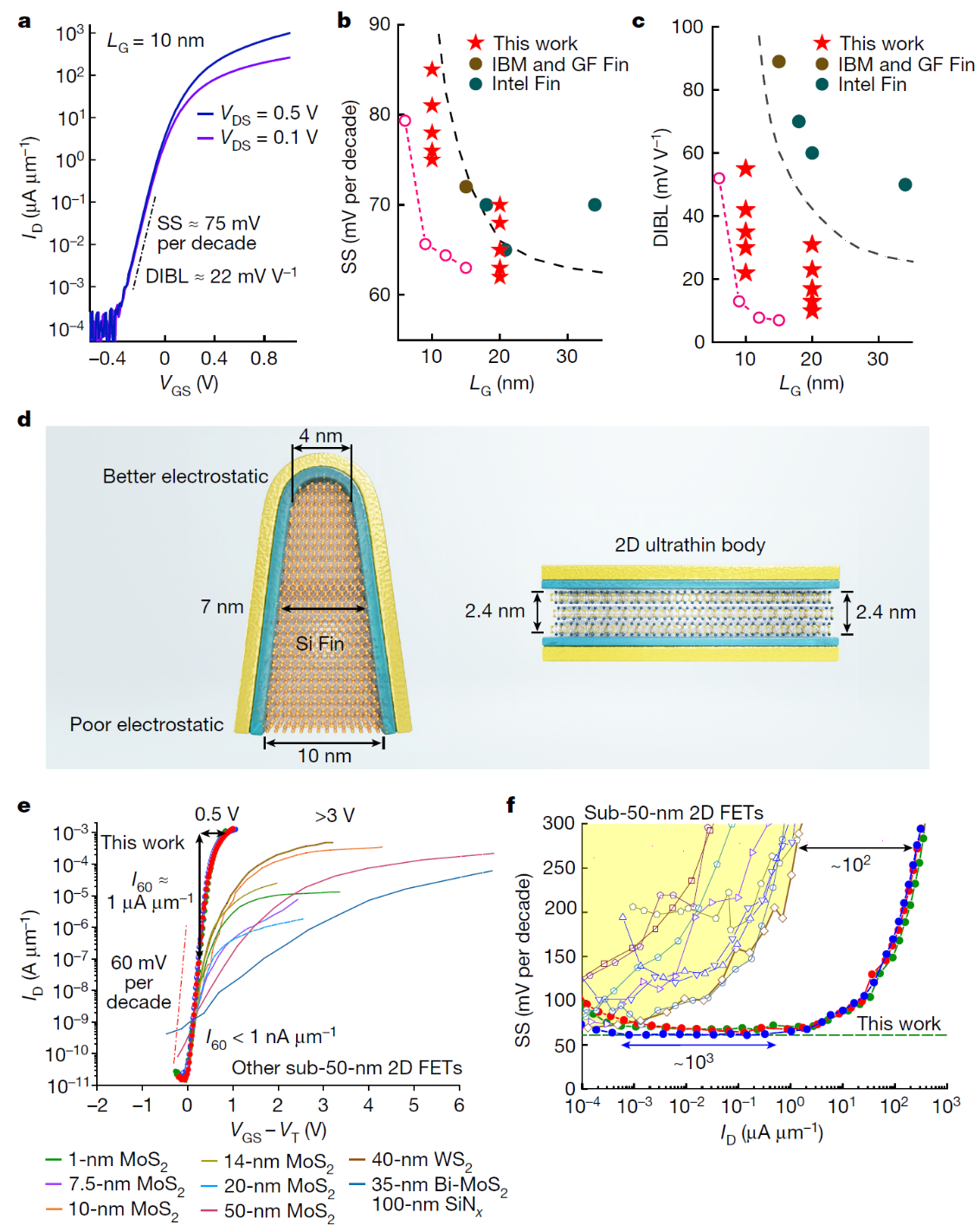 图2 弹道二维硒化铟晶体管与先进节点硅基晶体管的比较