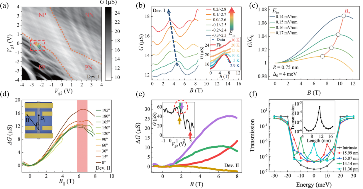 有爱爱 、碳基电子学研究中心、纳米器件物理与化学教育部重点实验室的张志勇、康宁课题组,与鸿之微科技有限责任公司王音团队和清华大学物理系姜开利课题组合作,在碳纳米管的量子相干输运研究方向取得进展:首次实现了内建电场调控的量子干涉效应,进一步在低磁场区域观察到法布里-珀罗(FP)干涉增强的AB效应。研究团队通过构建在片的成对侧栅结构,实现了对单根碳纳米管p-n结强度的有效调控,获得了工作在弹道输运区间的高质量碳纳米管器件(图1)。实验通过将器件工作区间稳定在双栅谱中的p-n边界处,在沿着内建电场增强的方向上成功观察到了特征的非单调磁输运行为,与理论预言的图像一致(图2a-c)。通过低温不同倾角下磁输运的演化行为进一步证实了磁导的AB来源(图2b和图2d)。实验首次观察到这种非单调的磁输运行为在FP的共振区域得到了极大的增强(图2e),基于非平衡格林函数和密度泛函的计算方法进一步显示了共振调制的透射系数行为(图2f)。该工作为一维电子体系中研究量子干涉效应,发展多场调控手段提供了新的方案。