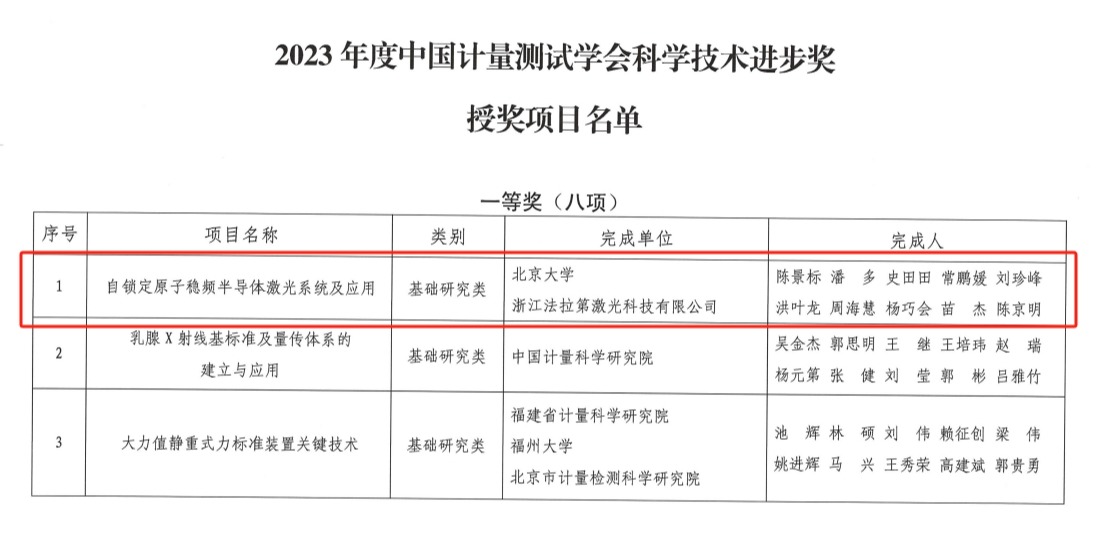 “中国计量测试学会科学技术进步奖”是2013年经国家科学技术部、国家科学技术奖励办公室批准的社会力量奖项(奖励编号:0234),是计量测试领域的最高奖,主要奖励在计量领域科学研究、技术创新与开发、科技成果推广应用和实现产业化方面取得卓著成绩或者做出突出贡献的项目。经中国计量测试学会科学技术进步奖评审委员会网络初审、会议复审和评审委员会终审会议、网上公示,2023年度中国计量测试学会科学技术进步奖授奖项目19项。此次获奖是对陈景标教授团队在量子计量领域长期工作的充分肯定。该成果显著提升了我国在量子计量领域的学术影响力,为实现国家高水平科技自立自强提供了重要支撑。