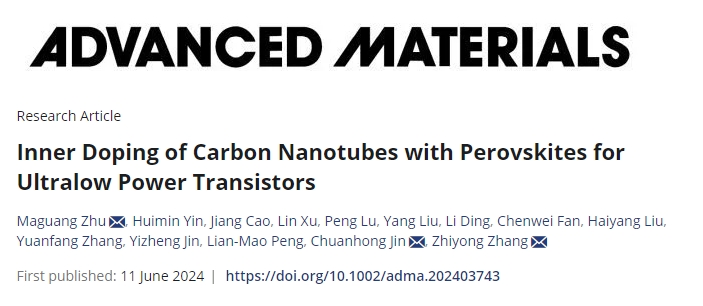 相关成果以题为“Inner doping of carbon nanotubes with perovskites for ultralow power transistors”的论文,于6月11日在线发表于《Advanced Materials》(Adv.Mater.2024, 2403743)。原有爱爱
