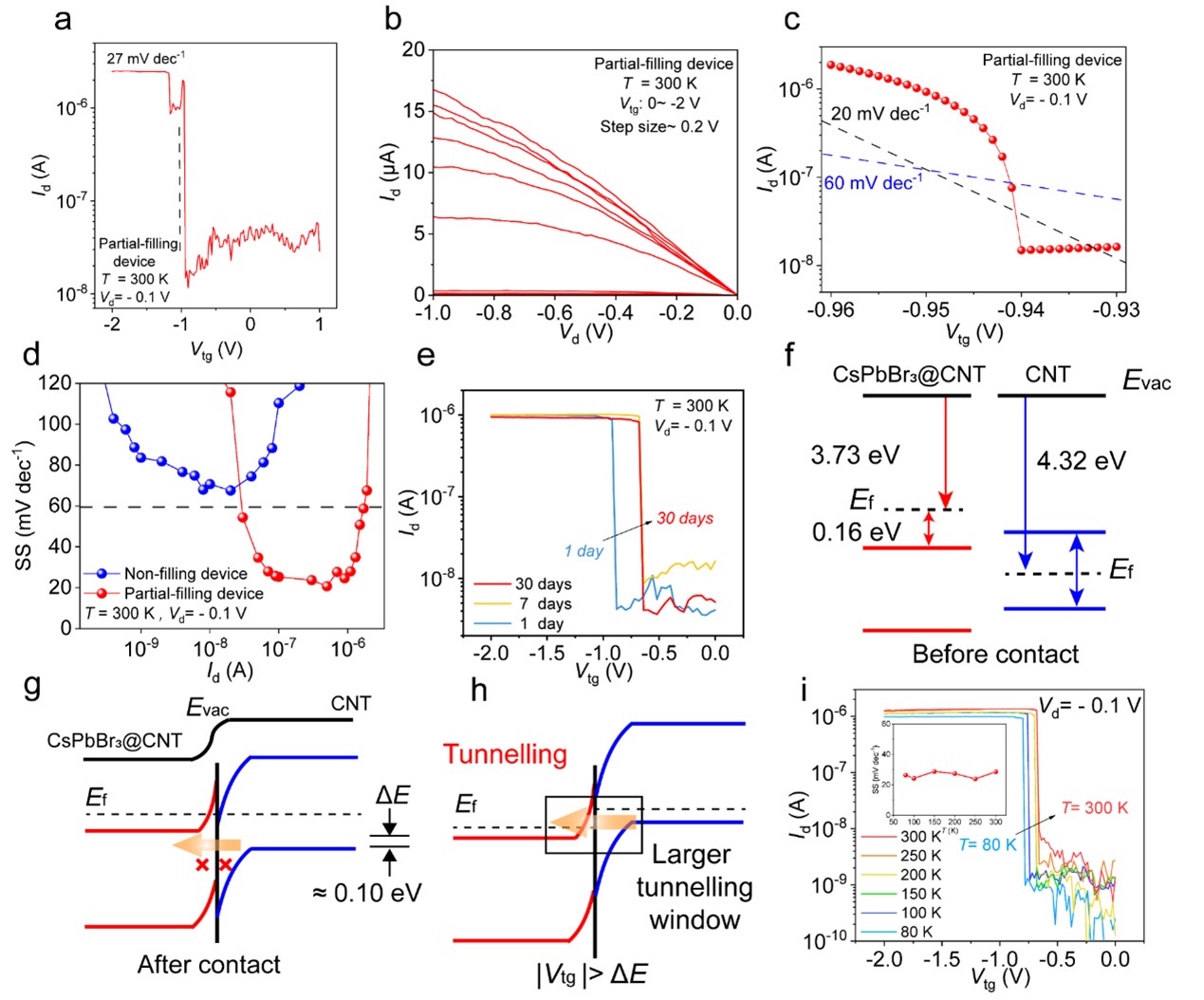 图3:超低功耗半填充掺杂CsPbBr3/CNT同轴异质结隧穿晶体管性能及其稳定性测试