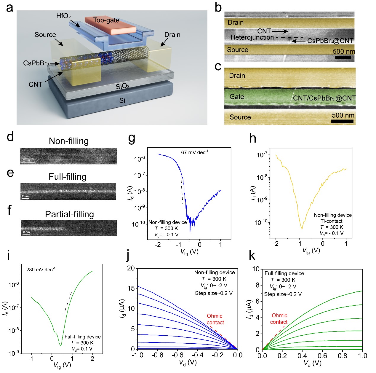 碳基电子学研究中心、纳米器件物理与化学教育部实验室张志勇教授、浙江大学金传洪教授、南京大学朱马光研究员课题组合作,利用碳纳米管气相/液相自组装填充技术,在碳纳米管内成功填充一维钙钛矿材料(CsPbBr3/CsSnI3),调控电学特性,并成功构建内掺杂碳纳米管CMOS晶体管。更重要的是,团队基于半填充钙钛矿-碳纳米管(CsPbBr3/CNT)同轴异质结,设计并首次展示了断隙(broken-gap)隧穿晶体管(TFET)。器件室温亚阈值摆幅约35 mV dec-1,开关电流比大于105,展示了一维钙钛矿掺杂碳纳米管材料在构建高性能和超低功耗集成电路领域的应用前景。