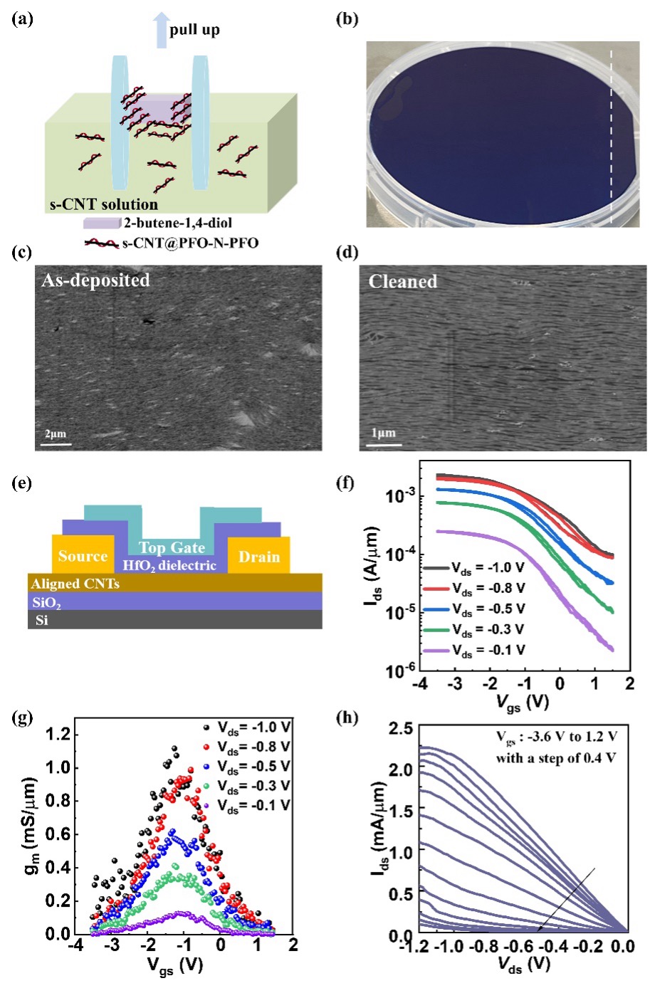 图2. 采用m-DLSA制备无聚合物包裹的A-CNTs及其晶体管电学性能