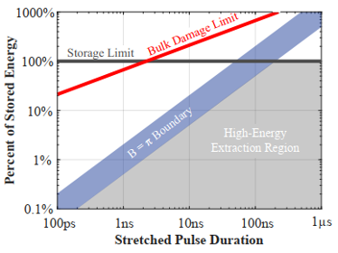 横坐标是展宽的脉冲宽度,纵坐标是脉冲提取效率。当脉冲展宽到100ns时,脉冲提取效率才能接近放大器储存能量的100%