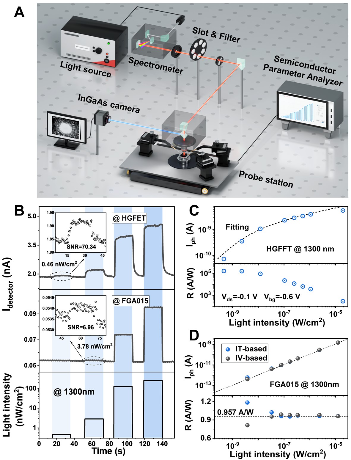 图2 碳基HGFET器件的超灵敏近红外光响应特性测试