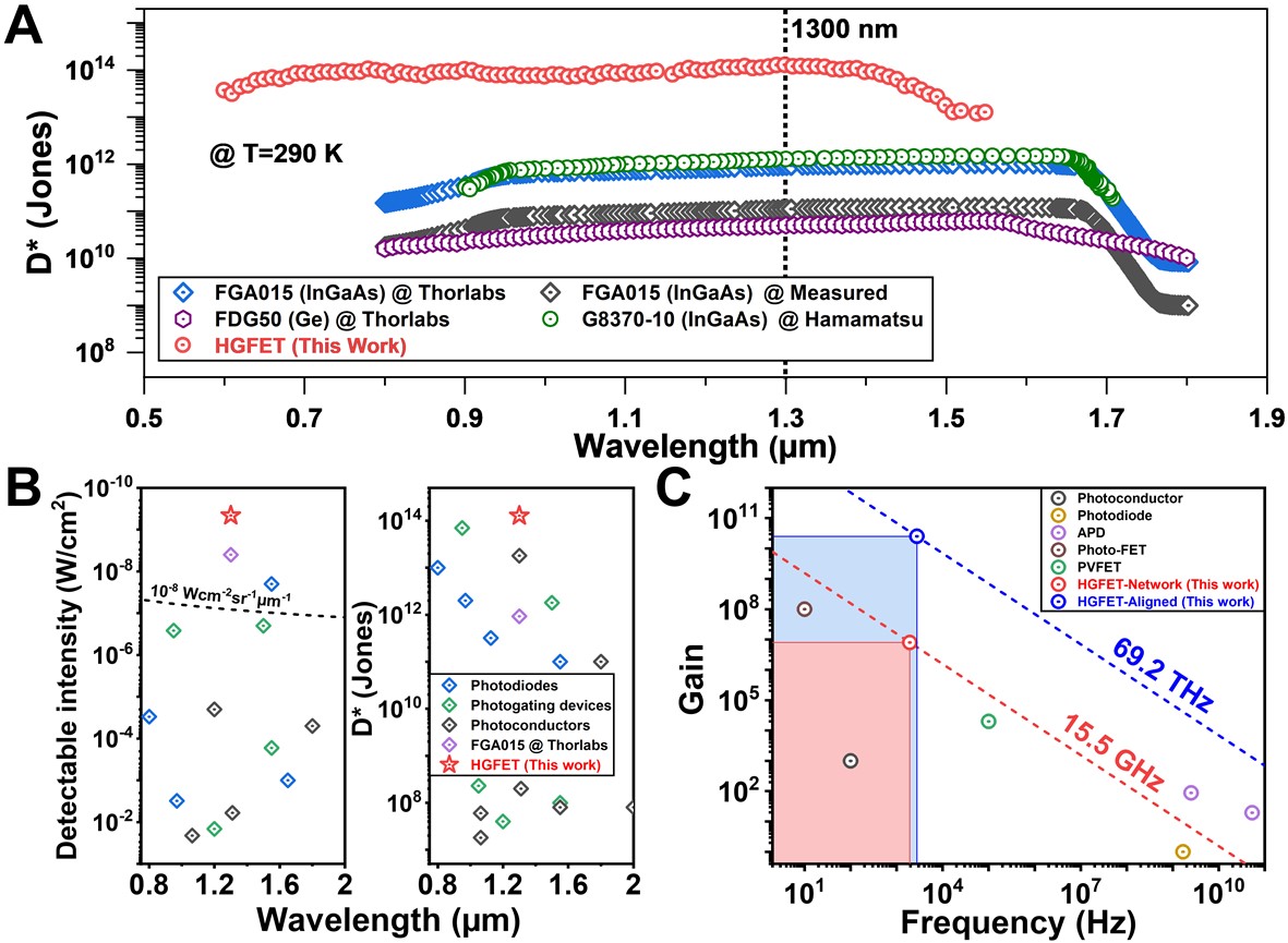 、碳基电子学研究中心、纳光电子前沿科学中心、重庆碳基集成电路研究院的张志勇教授团队联合北京交通大学物理科学与工程学院王颖副教授团队开发了一种异质结栅场效应晶体管(HGFET,图1),利用光电解耦机制,实现了对信号的超高增益,而基本不放大噪声,获得了对短波红外探测的比探测率达到1014Jones,充分满足了星光夜视的需求。团队采用高纯半导体碳纳米管网状薄膜作为半导体沟道构建MOS晶体管,在其栅介质上制备硫化铅量子点/氧化锌异质结光电二极管作为栅极,实现了光传感和电放大的物理空间隔离。该光电晶体管暗电流低,对极弱红外光(1300 nm,0.46 nW/cm2)具有显著的响应(图2),而且具有超高的本征增益和响应度、较低的噪声和较高的响应速度,在高增益模式下,峰值比探测率超过1014Jones。在同等测试条件下,碳基HGFET探测器比商用的InGaAs探测器的比探测率高出两个量级,并在增益带宽积上相对于已有探测器显示出明显优势(图3-4)。团队还基于碳基HGFET光电晶体管实现了64×64像素的板级成像芯片,初步演示了光强低至100 nW/cm2的弱光环境成像(图5)。更为重要的是,碳基HGFET探测阵列可以在硅基IC上利用后道工艺集成,通过通孔直接与硅基读出电路链接,可以将像素间距缩减到5微米以下,实现超高分辨率成像。