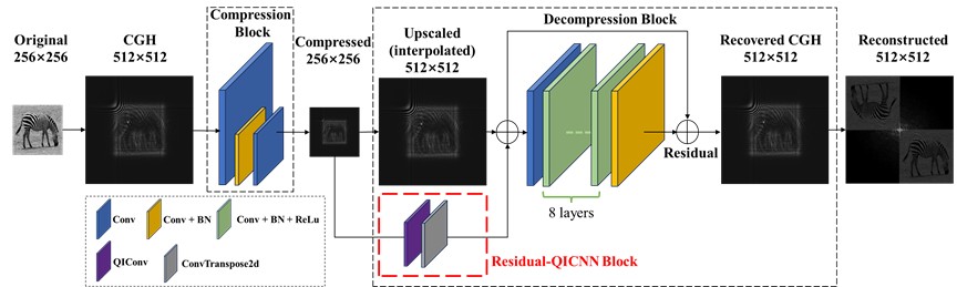 计算机生成全息图(CGH)能够完整记录和再现三维场景的光子波场信息,是未来立体显示技术的主要发展方向。然而,CGH数据量巨大,导致其在实时传输与存储方面面临巨大挑战。传统图像压缩算法因忽略全息图的全局衍射特性和复振幅信息,导致重建图像质量下降;而现有深度学习方法虽能自适应特征提取,但随机权重初始化易使模型陷入局部最优,限制了压缩性能的提升。因此,研究适用于CGH的高效压缩传输技术具有重要的科学意义与应用价值。如何在保证计算效率的同时提高压缩性能,成为该领域的关键科学问题。