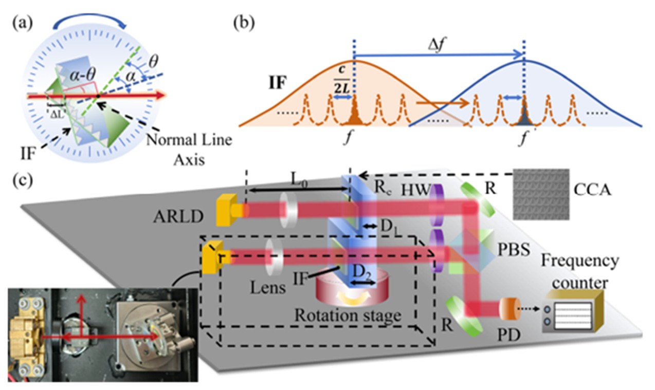 陈景标教授课题组提出了一种基于激光频率测量的角度测量新方法——量子频率角度仪。激光频率对干涉滤波器旋转角度的高灵敏度,将角度信息转化为频率信息。系统通过干涉滤光片与角锥阵列的联合设计,使激光频率与旋转角度精确耦合,并利用IF-ECDL(基于干涉滤波器的外腔激光器)实现了无跳模的连续频率调谐。理论分析表明,该方法的角度分辨率可达0.0001角秒,较传统方法提升了一个数量级以上,极大拓宽了小角度高分辨测量的应用边界。
