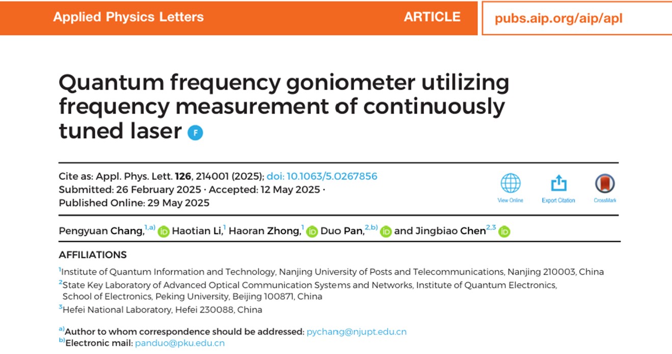 陈景标教授团队在超高分辨率角度测量研究领域方面取得了开创性进展,首次提出一种新型量子频率角度仪,将角度测量直接转换为频率测量,并可追溯到最精确的量子频率标准,建立起角度测量—量子频率标准—“米”和“秒”定义的溯源链,在精密制造、航空航天和前沿科学探索等领域的高精密微小角度测量需求方面具有重要意义。相关研究成果以“Quantum frequency goniometer utilizing frequency measurement of continuously tuned laser”为题,发表于AIP出版社旗下的学术期刊《Applied Physics Letters》,且被选为“Editor's Pick(编辑精选)”文章。