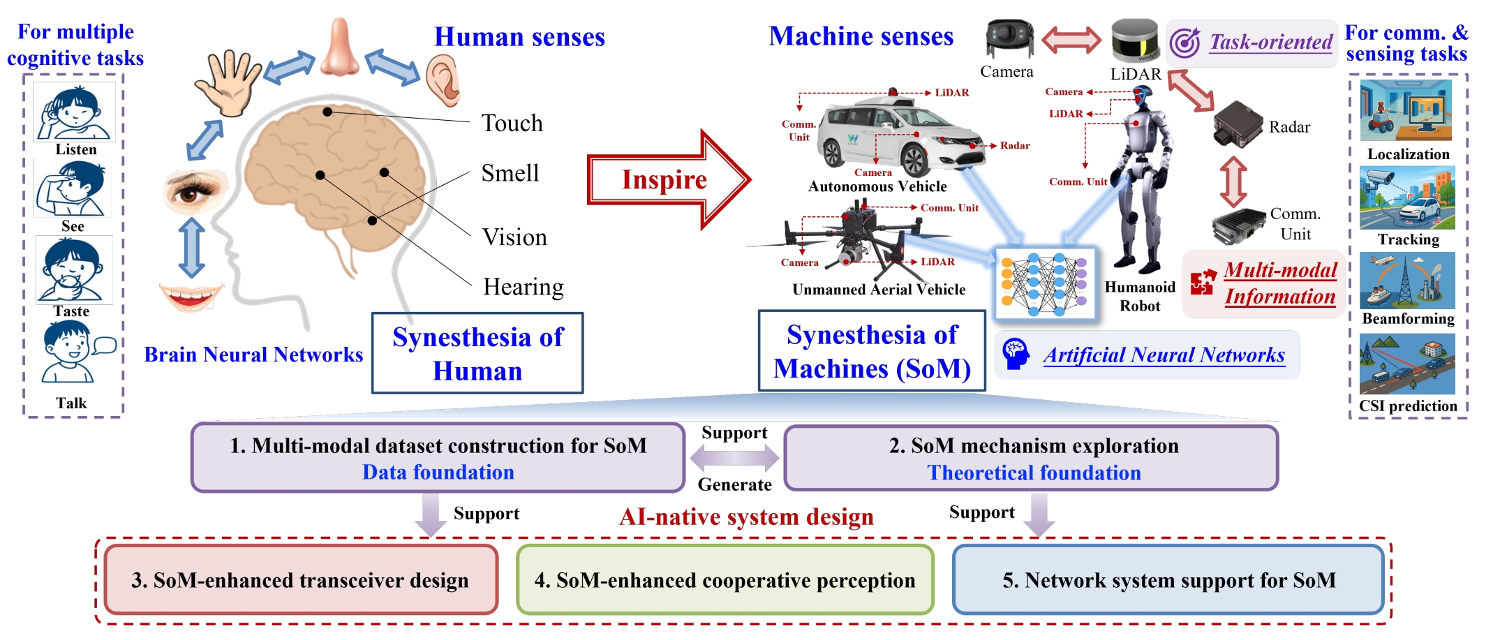 程翔教授团队首次提出“机器联觉(Synesthesia of Machines, SoM)”概念和架构,即面向通用任务的AI原生通信与多模态感知智能融合,有力支撑下一代网联具身智能系统设计,实现具身智能体(如无人车、无人机和人形机器人)从模仿人类(基于语音识别和非射频感知的单体智能,模仿人类执行视距内任务)到超越人类(充分利用通信单元实现“顺风耳”,融合射频感知实现“千里眼”,超越人类执行复杂超视距任务)。机器联觉的主要研究内容包括通信与多模态感知智能融合数据集构建、通信与多模态感知联觉机理挖掘、机器联觉辅助的收发机设计、基于联觉特征高效传输的协同感知方案设计、和支撑机器联觉的弹性网络设计。