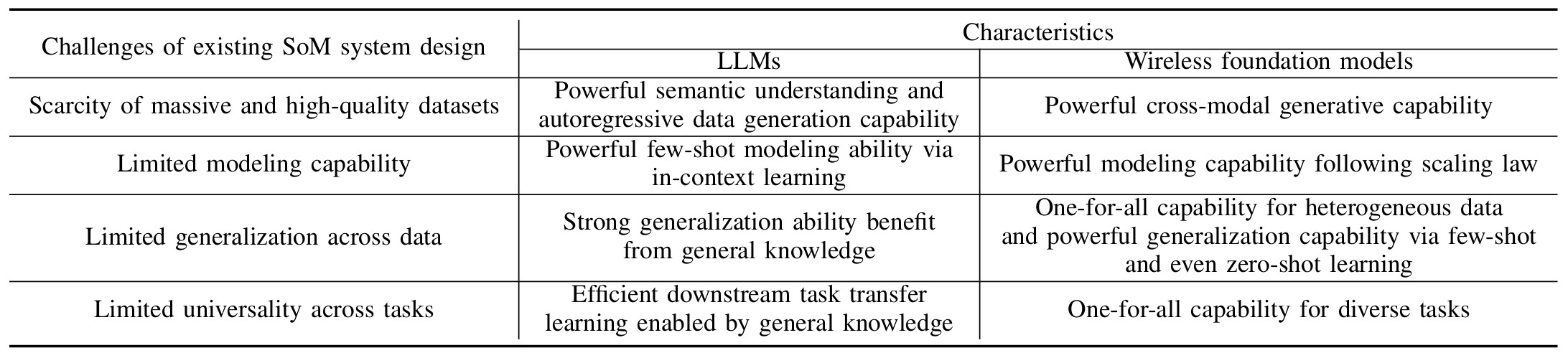 为填补领域空白,团队系统调研并首次提出赋能机器联觉相关领域的两类基座模型,包括通用基座模型(即大语言模型,LLM)和领域专用基座模型(无线基座模型)。团队首次提出了赋能机器联觉的通用基座模型的概念,包含多模态大语言模型(MLLM),实现以语言或非语言的方式跨领域迁移到机器联觉相关任务。此外,团队还首次提出了面向机器联觉领域的专用基座模型(无线基座模型)的概念,即模型在大规模无线和多模态感知数据上进行预训练(以自监督学习为主)后,可以通过微调或零样本应用于大量下游机器联觉系统设计相关任务,并大幅超越任务专用模型的性能。团队全面总结了两类基座模型在解决机器联觉现有挑战的优势,包括强大的跨模态生成能力、少样本建模能力、零样本泛化能力和一模多用能力,为机器联觉系统设计提供了全新研究思路与范式。
