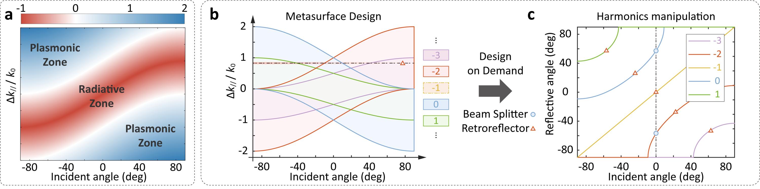 自广义斯涅尔定律(Generalized Snell’s Law, GSL)提出以来,平面超表面利用相位梯度灵活调控波前,在光学与电磁波调控领域取得了显著进展。广义斯涅尔定律善于量化相位梯度对波束基波分量的影响,但难以处理单元间强耦合引发的空间谐波分量,也使超表面常被局限为“单通道”器件,制约了其在宽角域与多通道方面的应用。因此,亟需建立一套能够系统解析相位梯度、超晶胞周期与弗洛奎谐波之间关联的确定性理论,全面释放超表面在全通道操控中的潜力。