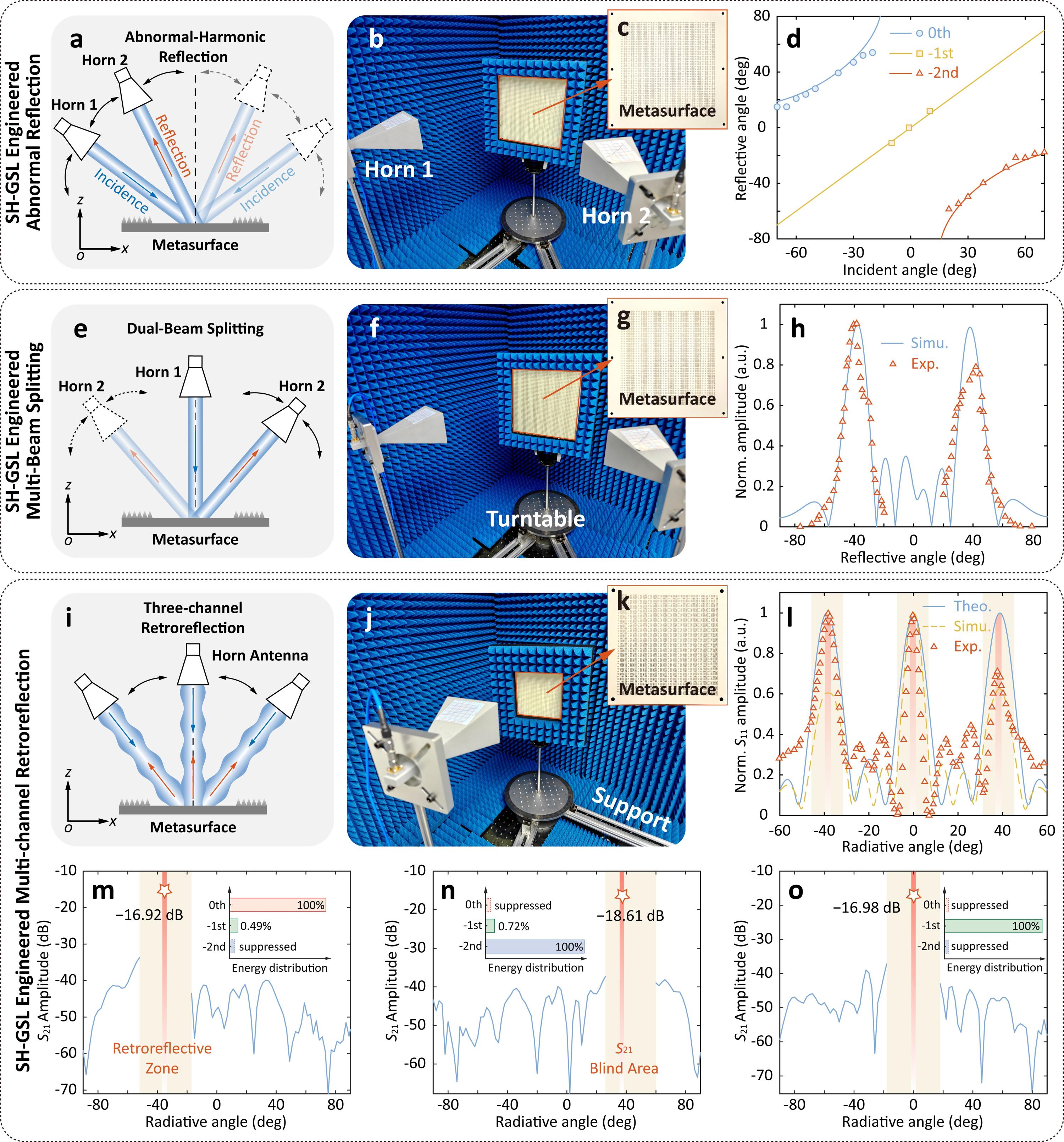 图3:a 单边异常反射测试示意图;b 单边异常反射测试现场图;c 单边异常反射超表面;d 单边异常反射测试结果;e 双波束分裂测试示意图;f 双波束分裂测试现场图;g 双波束分裂超表面;h 双波束分裂测试结果;i 三通道回射测试示意图;j 三通道回射测试现场图;k 三通道回射超表面;l 三通道回射S11测试结果;m-o 三通道回射S21测试结果。
